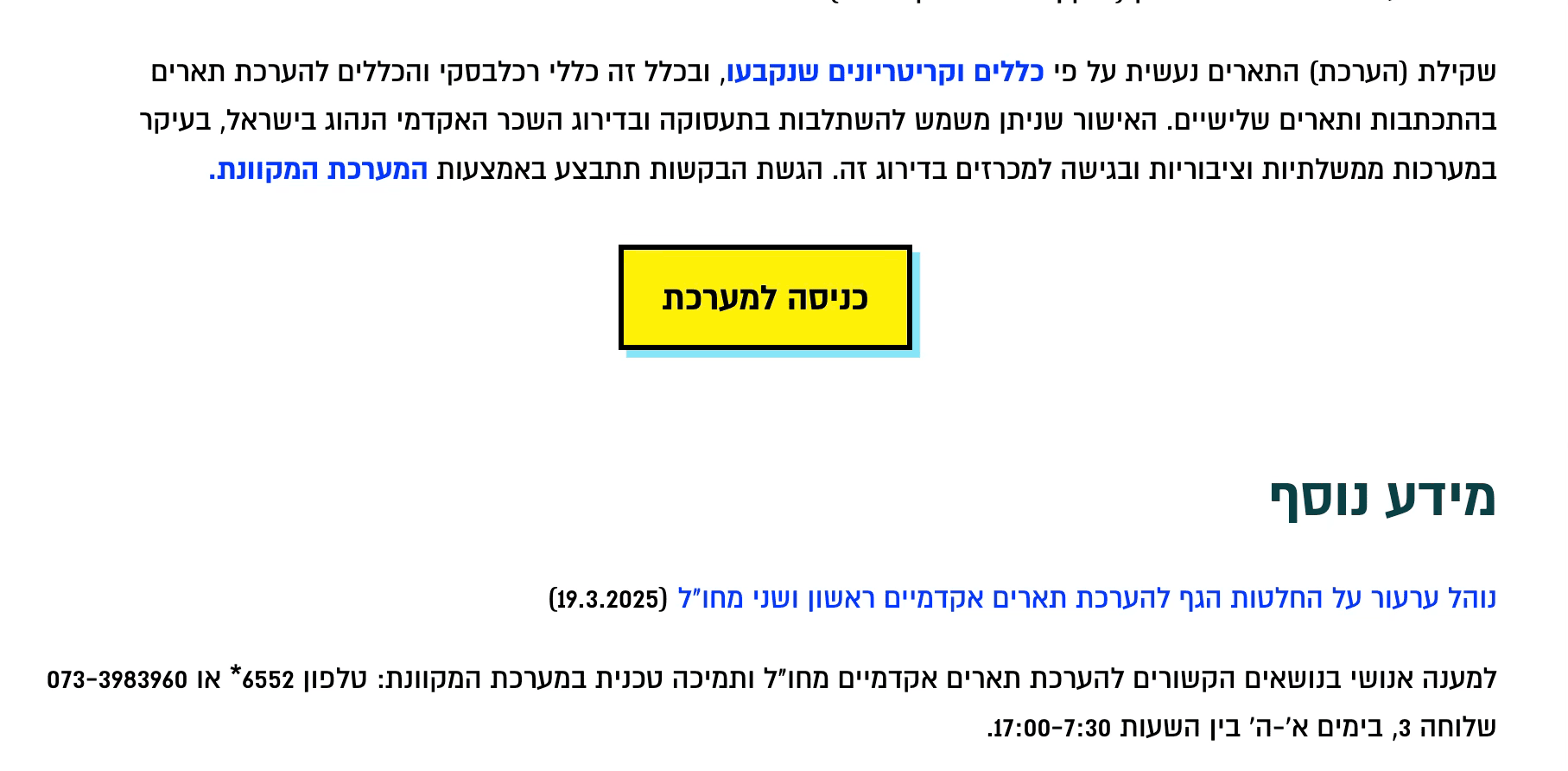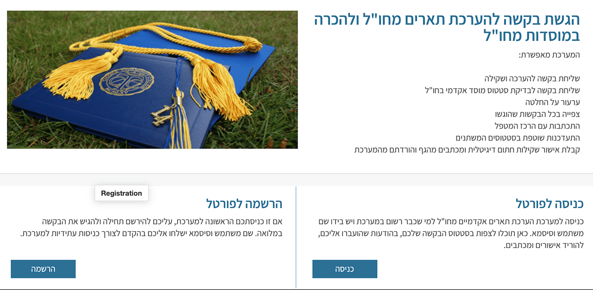 Далее вы заходите на сайт Министерства образования в раздел «Подтверждение академической степени, полученной за границей» и нажимаете на жёлтую кнопку «כניסה למערכת» в центре страницы.