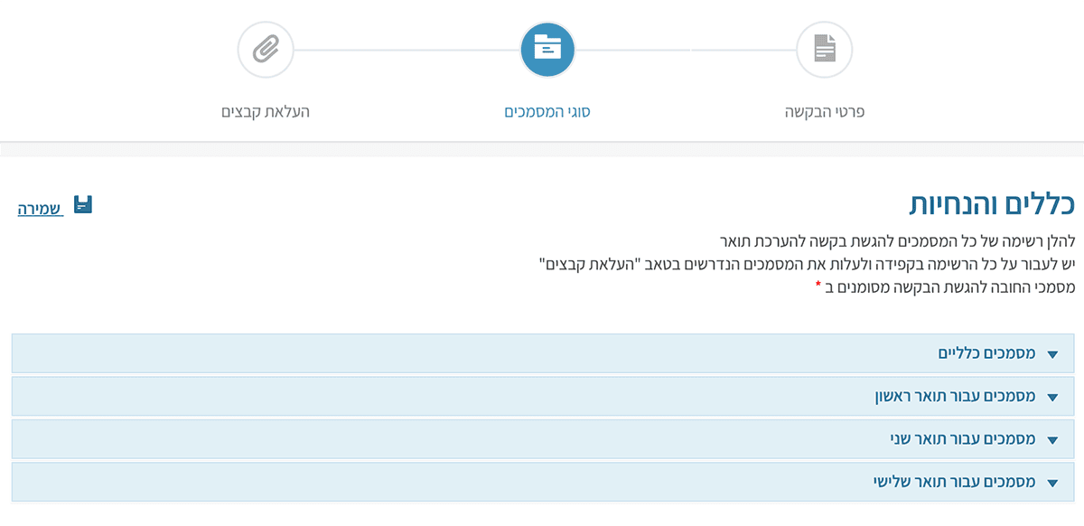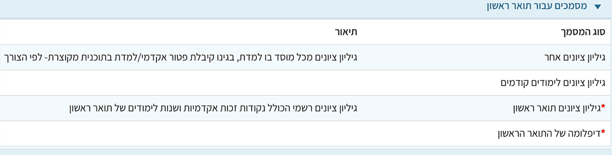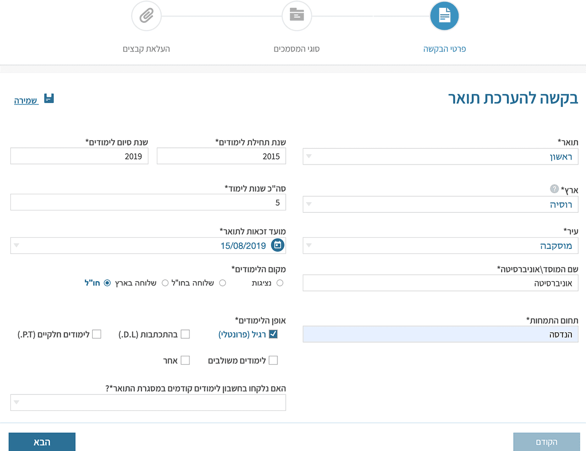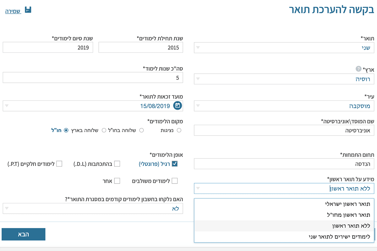 При заполнении всех этих граф в форме появляется дополнительное поле зачёта предшествующей учебы для получения степени (если есть). Отвечаете на этот вопрос и нажимаете синюю кнопку «далее». («הבא»)