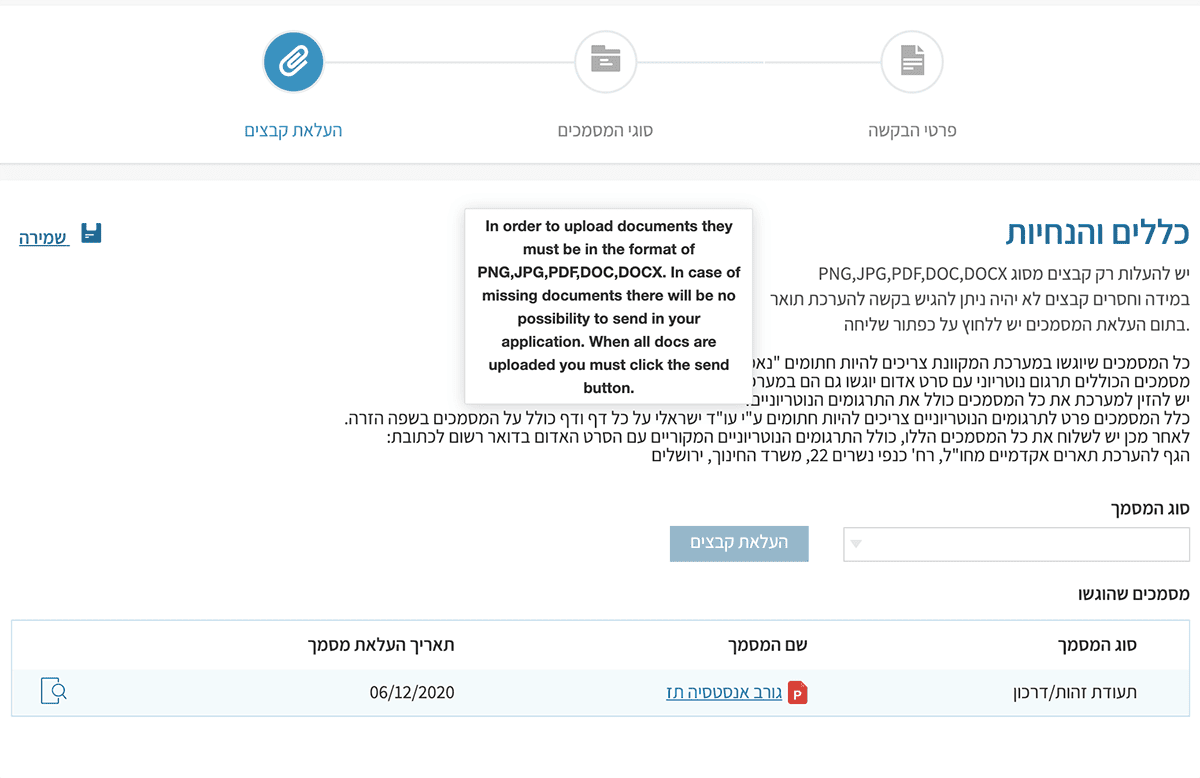 Все начинается с заверения необходимых документов (у адвоката или в Министерстве алии и интеграции) и сканирования каждого документа отдельным файлом.