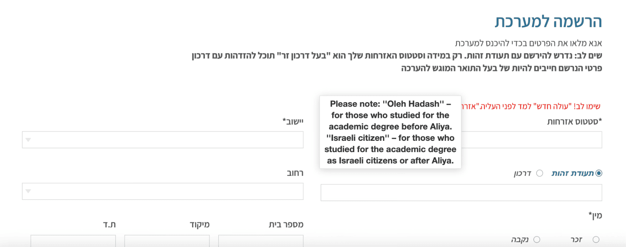 В соответствующем селекторе обязательно выбирайте свой статус «оле хадаш», а не «гражданин»! Исправить ошибку выбора далее будет крайне проблематично!