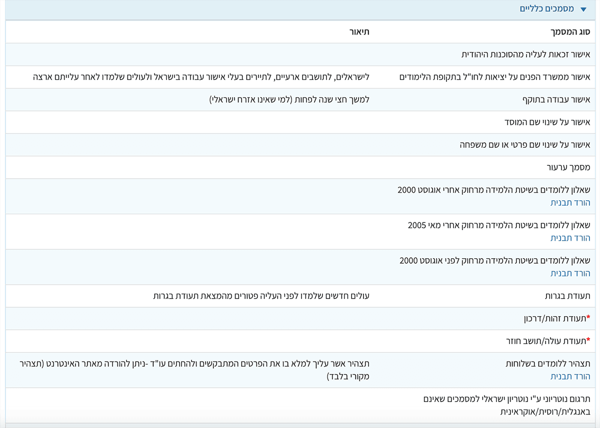 Те документы, которые в каждом меню отмечены звездочкой, обязательны для прикрепления. Среди общих документов для нового репатрианта — теудат зеут и теудат оле.