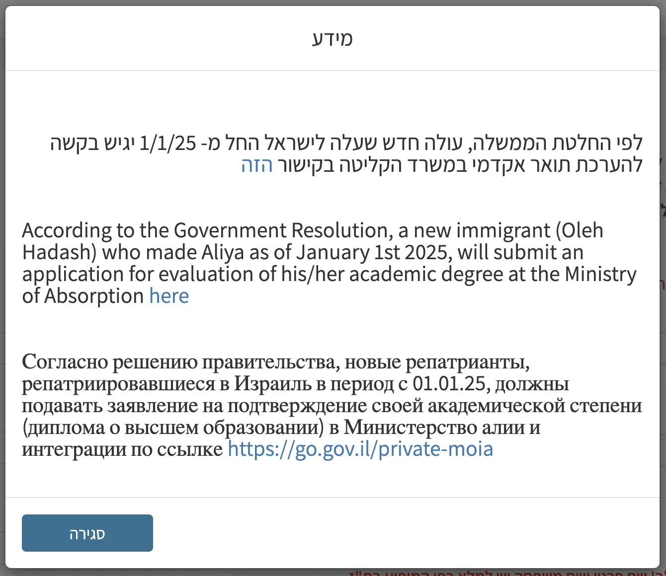 ВАЖНО: Система напомнит вам, что если вы репатриировались в 2025 году и позже, подавать заявку надо через Министерство абсорбции.
